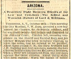 (Transcripción del texto de la noticia) A Desperate Fight Between Officers of the Law and Cow-Boys--The Killed and Wounded--Failure of Lord and Williams Tombstone, A.T., October 26th -- This morning, the City Marshall, V. W. Earp, arrested a cow-boy named Ike Clanton, for disorderly conduct, and he was fined twenty-five dollars and disarmed in the Justices' Court. Clanton left, swearing vengeance on the Sheriff and Marshall Earp and his brother Morgan who tried to induce Clanton to leave the town, but he refused to be pacified. About three o'clock P.M., the Earp brothers and J.H. Halliday met four cow-boys, namely the two Clanton brothers and the two McLowery brothers, when a lively fire commenced from the cow-boys against the three citizens. About thirty shots were fired rapidly. When the smoke of battle...(image cuts off here) [Wikipedia]