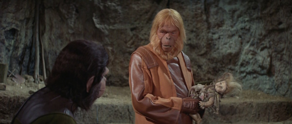 Un desesperado Dr. Zaius sujeta la muñeca humana parlante ante la estupefacta mirada de Cornelius.