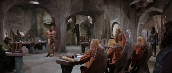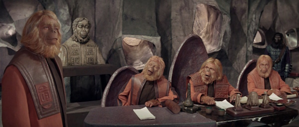 Tribunal que juzga al díscolo humano: el Dr. Zaius, Honorius, Maximus, y el presidente de la Academia.