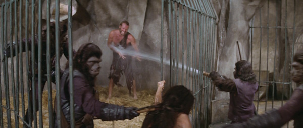 Tras ser apresados, los humanos son encerrados e higienizados. Durante el rodaje Charlton Heston padeció la gripe, y las escenas en las que era regado con el chorro fueron especialmente molestas.