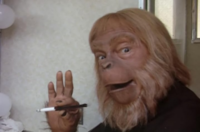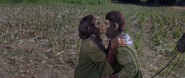 Curiosa escena de Zira y Cornelius besándose tras 3 horas de maquillaje previo. La compleja elaboración de las diferentes caracterizaciones de los simios (había chimpancés, gorilas y orangutanes, y se descartaron los bonobos por presupuesto) obligaron a los actores a mantener su caraterización durante muchas horas. Horas en las que tenían que beber a través de pajitas, comer delante de un espejo para no estropear nada, y fumar con boquilla.