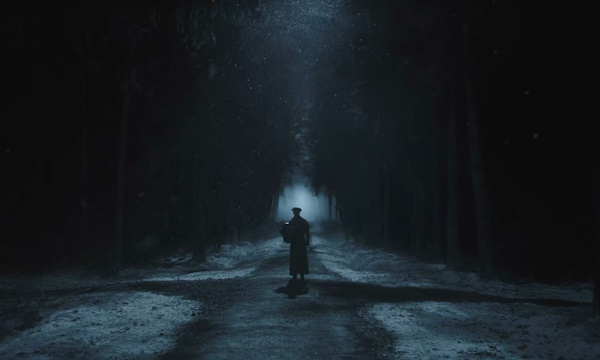 Un cruce de caminos, niebla en la noche, y un coche de caballos aproximándose sin conductor