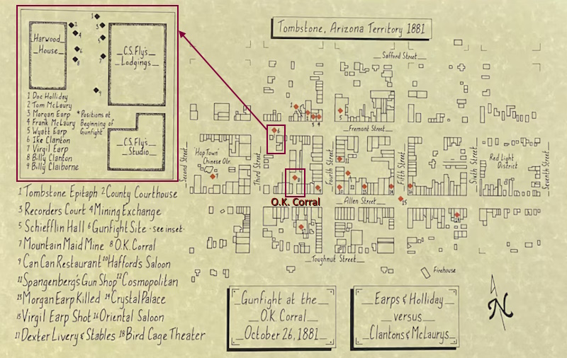 Localización de O.K. Corral y del lugar real del tiroteo en un mapa de Tombstone. También se muestra, en el recuadro superior, la situación de los participantes al inicio del duelo.